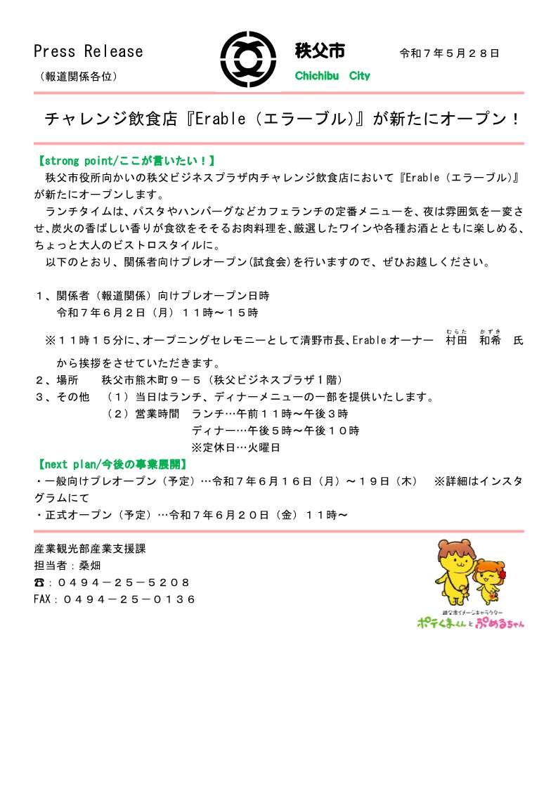 新たにオープンするチャレンジ飲食店「Erable(エラーブル)」についてお知らせします。